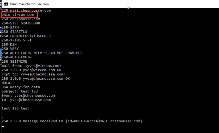 EHLO <yourdomain.com> command (In this case Vircom.com)