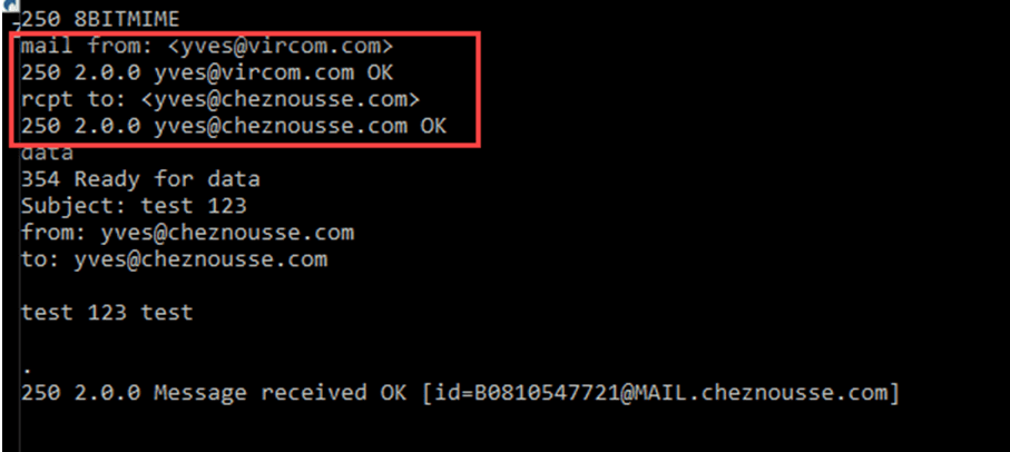 If the recipient address (e.g., yves@cheznousse.com) doesn’t exist, the server would typically return an error like ‘550 no such user here’ instead of 250 OK.