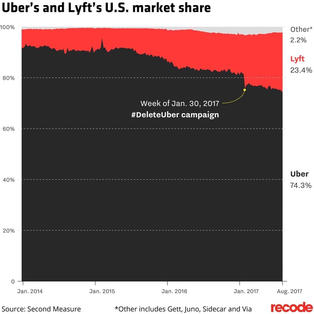 The average active Uber user is spending $50/month. That works out to $10 million/month in lost revenues – that is a very significant number, especially given with the tiny margins Uber operates on. We also have no idea on how this might impact the number of drivers and the resulting availability of service, while the #deleteUber movement was certainly one of the biggest gifts Lyft and other competitors ever saw.