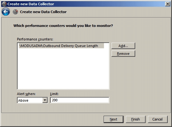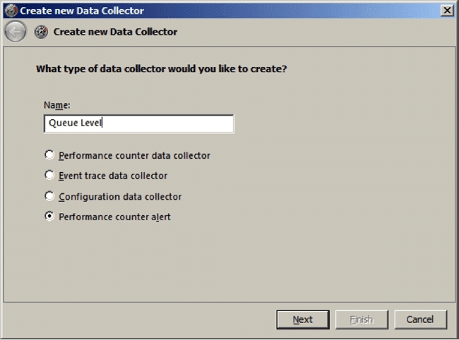 - Entrez un nom pour le collecteur de données, sélectionnez Alerte de compteur de performance dans la liste et cliquez sur Suivant.