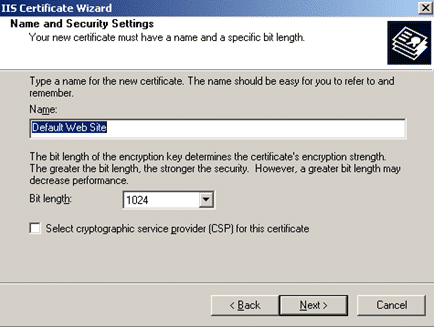 6. Dans la case Nom, entrez un nom convivial à utiliser lorsque vous faites référence à votre certificat (ou laissez simplement le nom par défaut si vous n’avez qu’un seul site Web) et cliquez sur Suivant