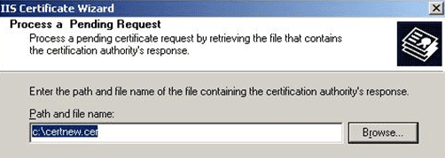 1. Une fois que vous avez obtenu votre certificat, répétez les étapes 1 et 2 ci-dessus (c.-à-d. ouvrez IIS, cliquez avec le bouton droit de la souris sur le site Web et choisissez Certificat de serveur). Sélectionnez Traiter la demande en attente et installez le certificat , puis cliquez sur Suivant.