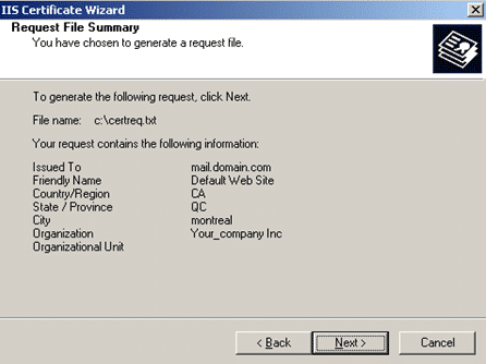 13. Entrez le nom du fichier de votre demande de certificat et le chemin où vous souhaitez sauvegarder le fichier; cliquez sur Suivant