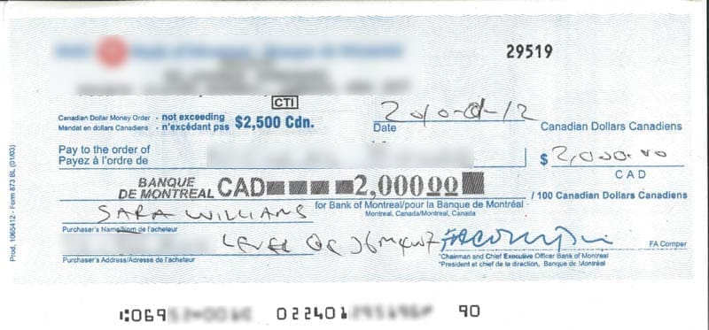 Un mois plus tard, le mandat arrive enfin pour un montant de 2 000 $. Mal fait, c’était évidemment un faux. La commande est arrivée avec une lettre, qui est une véritable photocopie en vrac faite pour des yeux experts (avec un fondu sur le côté gauche). La lettre m’indique d’encaisser le mandat et d’envoyer le solde restant à l’expéditeur tiers.